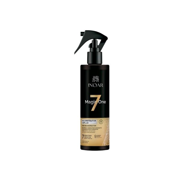 O Reconstrutor Capilar Inoar Magic One 7 300ml é um tratamento multifuncional com ação instantânea, desenvolvido para restaurar profundamente os cabelos danificados. Com uma fórmula rica em ativos reparadores, ele oferece sete benefícios em um único produto, atuando na reconstrução da fibra capilar, reposição de massa, brilho, maciez, hidratação, proteção térmica e controle do frizz. Indicado para todos os tipos de cabelo, especialmente os que passaram por processos químicos ou estão fragilizados.